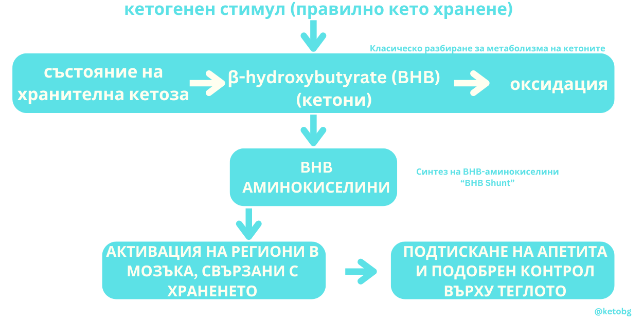 Новите факти, които разкрива настоящото изследване откриват, че BHB участва и в друг метаболитен път. В този случай BHB се свързват със свободните аминокиселини и образуват нов тип кетонови метаболити – BHB-аминокиселини (BHB-Phe) за които учените смятат, че съдържат потенциал да контролират затлъстяването.